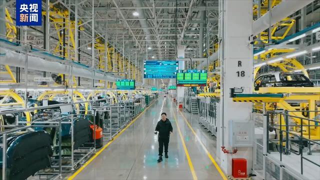 总台央视记者 李厦:流程多长?我带你看看去!这里就是一座新能源车的超级工厂,看,这里配备了超过1600台智能终端和3000多台机器人,它们智能协同工作,关键生产工序实现了100%自动化。这个繁忙的产线,几分钟就能有一台新能源车下线。
